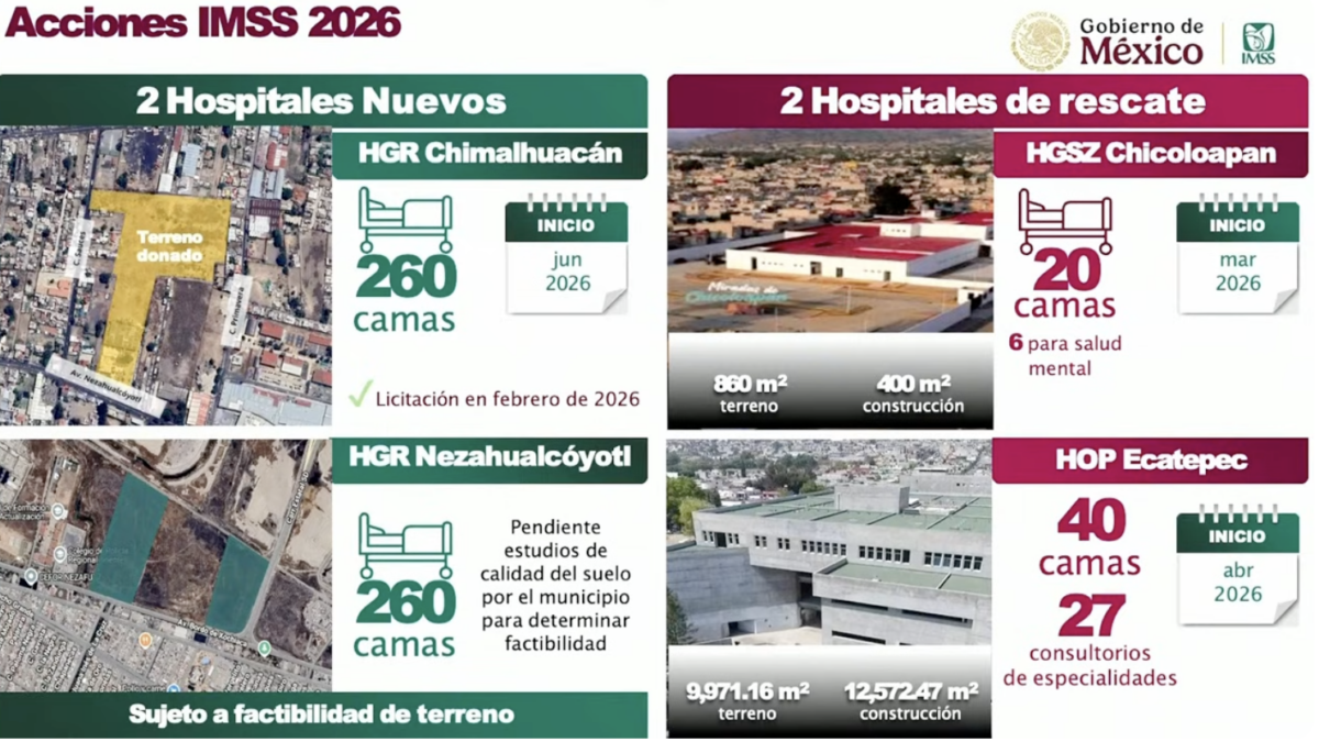 Se tiene programado edificar cinco nuevas Unidades de Medicina Familiar, en Tlalnepantla y Valle de Chalco, además de Texcoco, Chalco y Los Reyes la Paz, donde solo esperan que se concrete la donación del terreno para iniciar las obras, mientras que en Ixtapaluca, aun no se cuenta con el terreno.