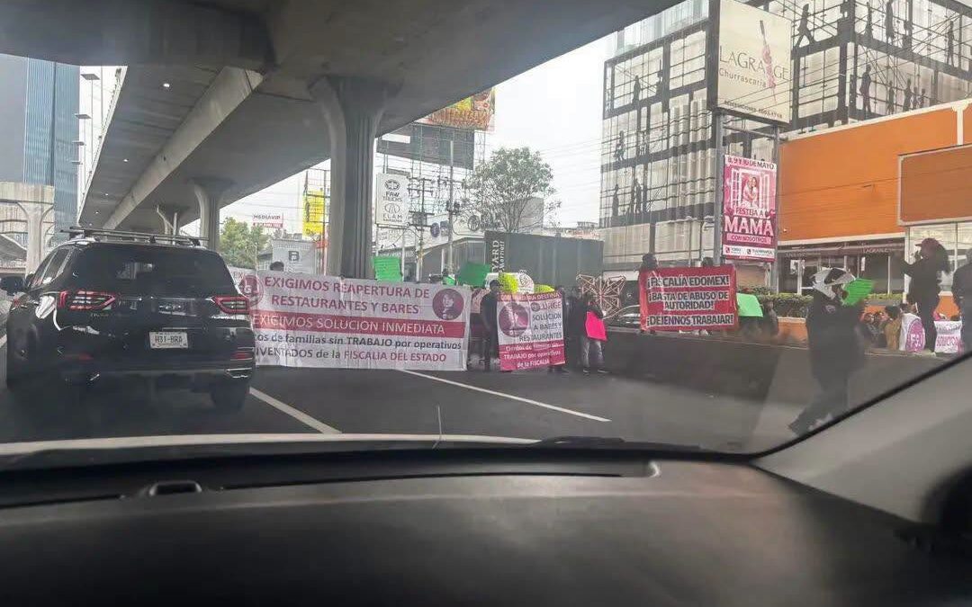 En Periférico Norte, un grupo de trabajadores de bares, restaurantes y otros establecimien5os comerciales que han sido clausurados por las autoridades por estar implicados en carpetas de investigación de la Fiscalía mexiquense bloquearon el paso en carriles centrales y laterales de esta vialidad a la altura del Toreo Cuatro Caminos, com dirección a la capital del país.