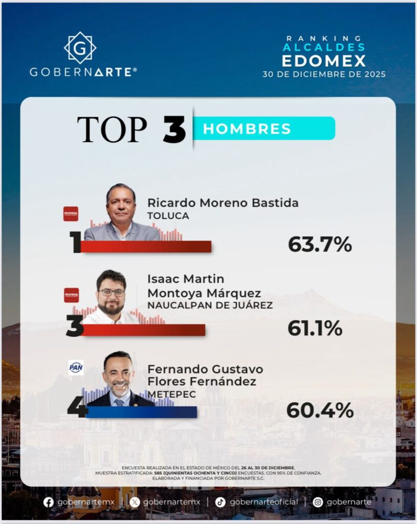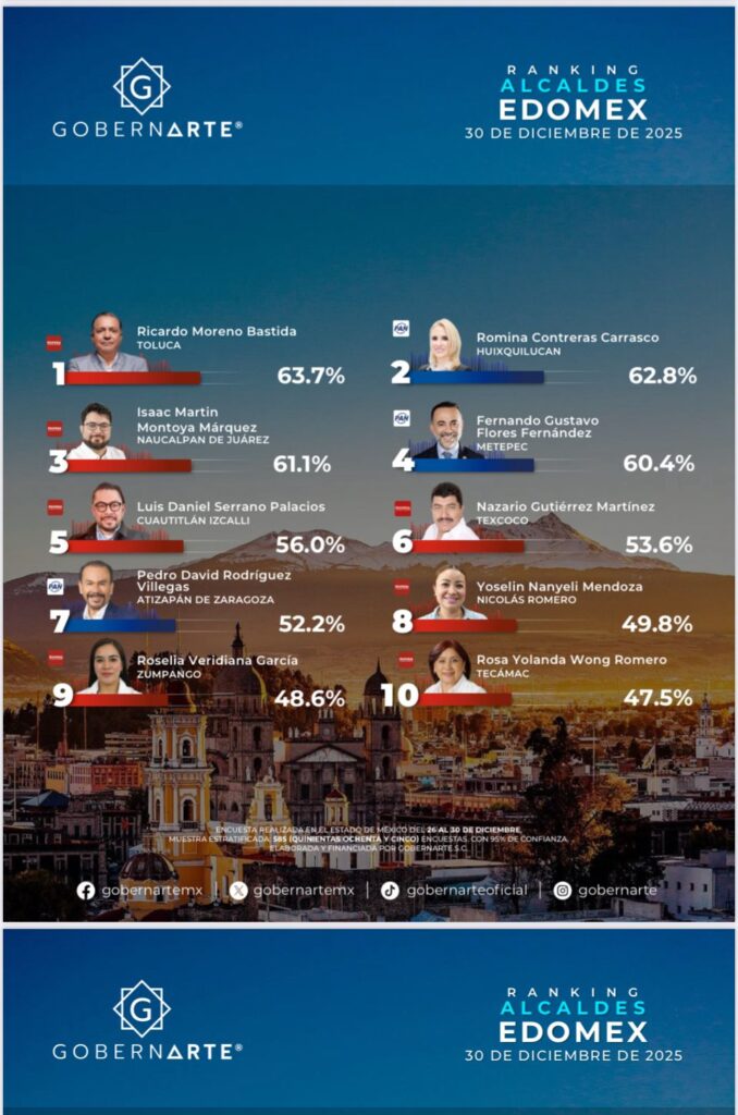 El estudio fue realizado del 26 al 30 de diciembre de 2025, con una muestra estratificada de 585 encuestas por municipio y un nivel de confianza del 95 por ciento, y evalúa la percepción ciudadana sobre el desempeño de las y los alcaldes del Estado de México.