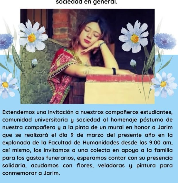 Convocaron a la comunidad universitaria y sociedad al homenaje póstumo de su compañera y a la pinta de un mural en su honor, el cual se realizará el día 9 de marzo del presente año en la explanada de la Facultad de Humanidades desde las 9 de la mañana.