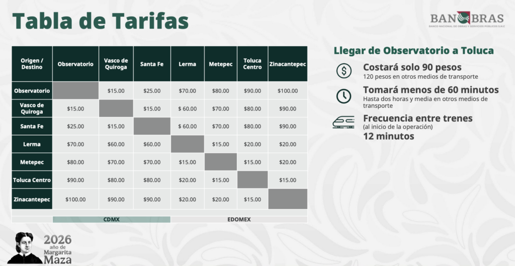 Este lunes también entraron en vigor las nuevas tarifas del Tren, que van de los 15 pesos, para quien recorre una sola estación en el Valle de Toluca, hasta los 100 pesos por el trayecto completo que va de Zinacantepec hasta Observatorio, que a decir de  Jorge Alberto Mendoza Sánchez, director de Banobras, –instancia encargada de la operación de “El Insurgente” , es más barato y seguro que otros medios se transporte entre el Valle de Toluca y la Ciudad de México.
