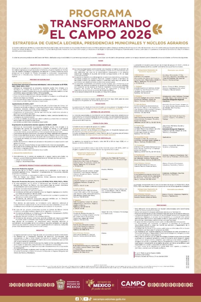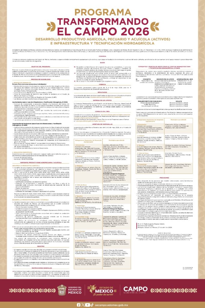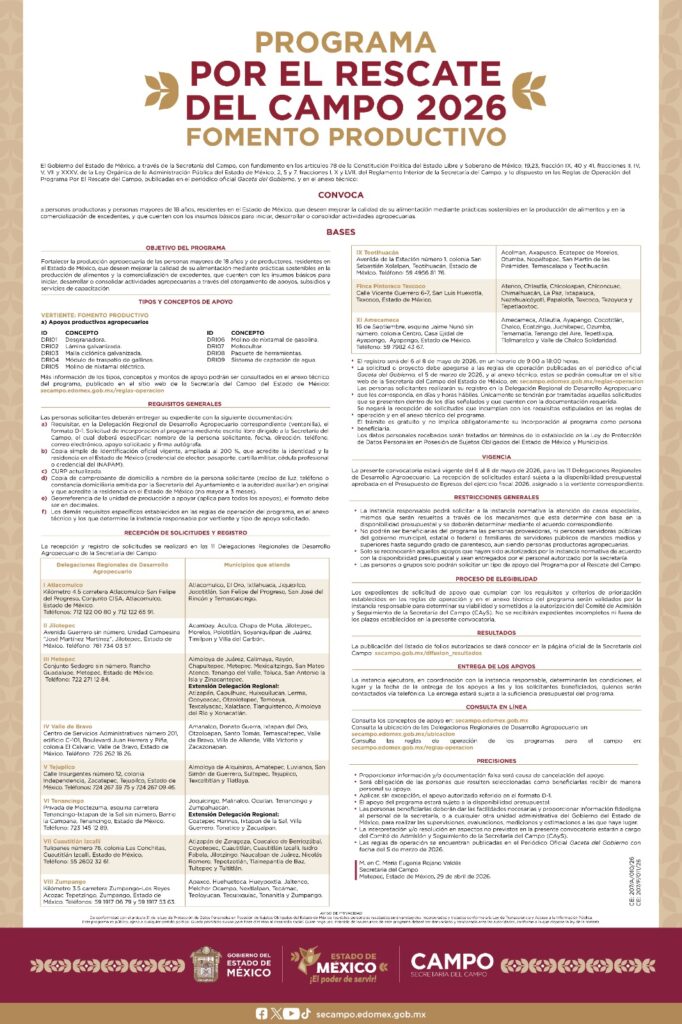 Texcoco, Edomex. 29 de abril del 2026.- Los días 6, 7 y 8 de mayo de 2026, las 11 Delegaciones Regionales de la Secretaría del Campo del Gobierno del Estado de México, recibirán las solicitudes de inscripción a los programas Transformando el Campo y Por el Rescate del Campo, con apoyos que van desde implementos y herramientas para pequeñas unidades de producción, hasta subsidios para la adquisición de ganado, drones y tractores.