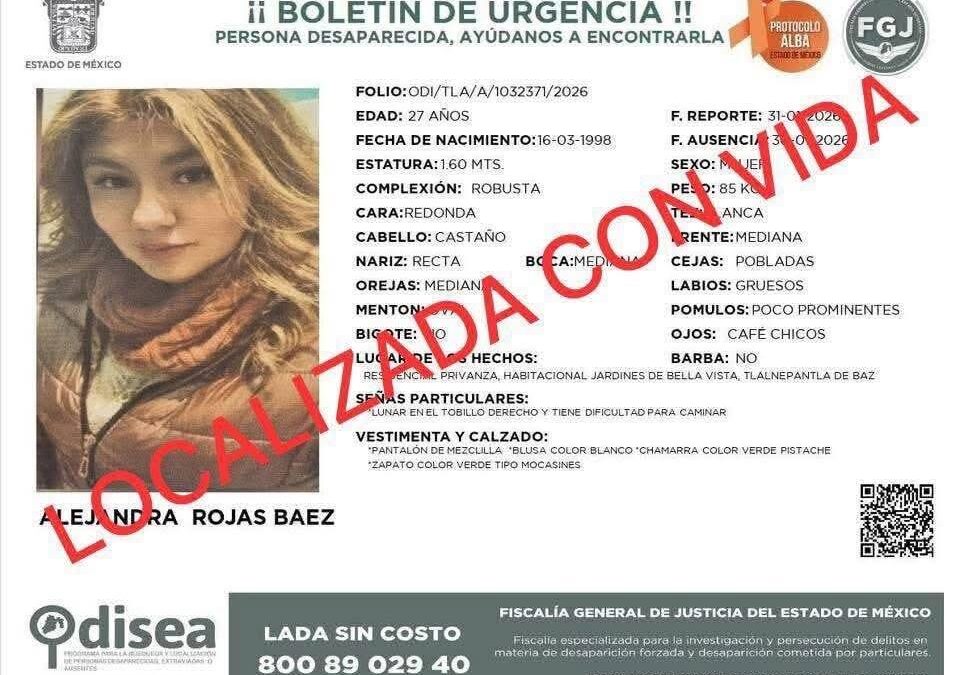 Naucalpan, Edomex, 2 de febrero del 2026.- Autoridades municipales de Jilotzingo confirmaron que la mañana de este lunes fueron localizados  Alejandra Rojas Báez, coordinadora municipal del partido Movimiento Ciudadano, y su primo Noe Jacob Pérez Rojas, quienes se encontraban en calidad de desaparecidos desde el viernes pasado.