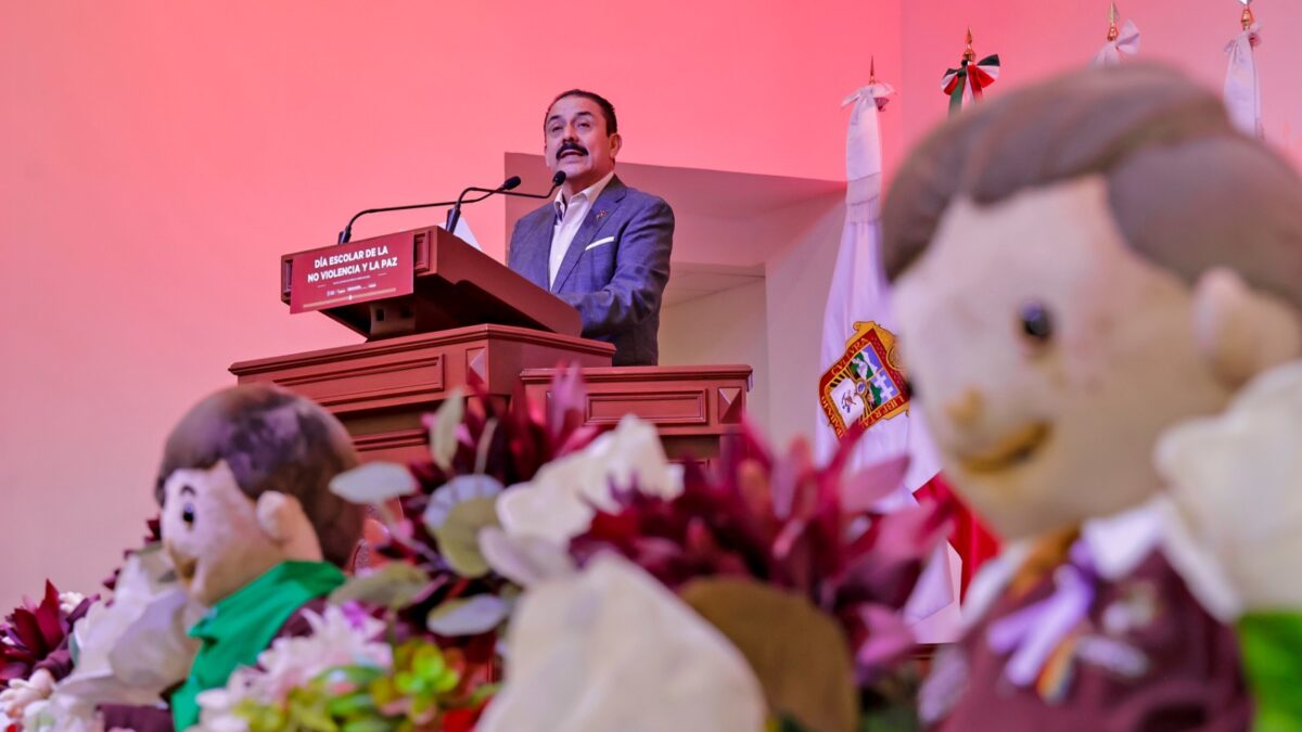 En el marco del “Día Escolar de la No Violencia y la Paz”, Miguel Ángel Hernández Espejel, titular de la Secretaría de Educación, Ciencia, Tecnología e Innovación (SECTI), destacó que construir paz desde las escuelas es dejar cimientos sólidos desde los primeros años de formación para convivir, a resolver conflictos sin violencia y a participar de manera responsable en la vida comunitaria.