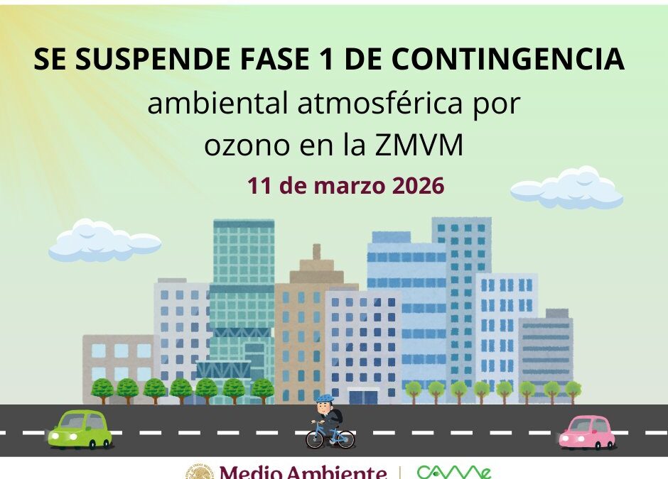 Ciudad de México, 11 de marzo de 2026.- La Comisión Ambiental de la Megalópolis determinó suspender la contingencia ambiental atmosférica por ozono y sus medidas a partir de las 19:00 horas de este miércoles, por lo que el programa de restricción vehicular Hoy No Circula operará con toda normalidad para este jueves 12 de marzo, ante una mejora en la calidad del aire de la Zona Metropolitana del Valle de México.