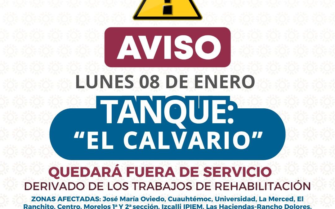 Toluca, Edomex, 3 de enero de 2026.- El Gobierno de Toluca comenzará a realizar los trabajos de rehabilitación del tanque El Calvario a partir del 8 de enero, lo que ocasionará una falta de suministro en el servicio de agua potable en 14 colonias de la zona centro de la capital mexiquense.