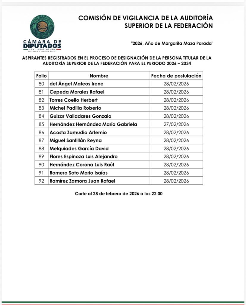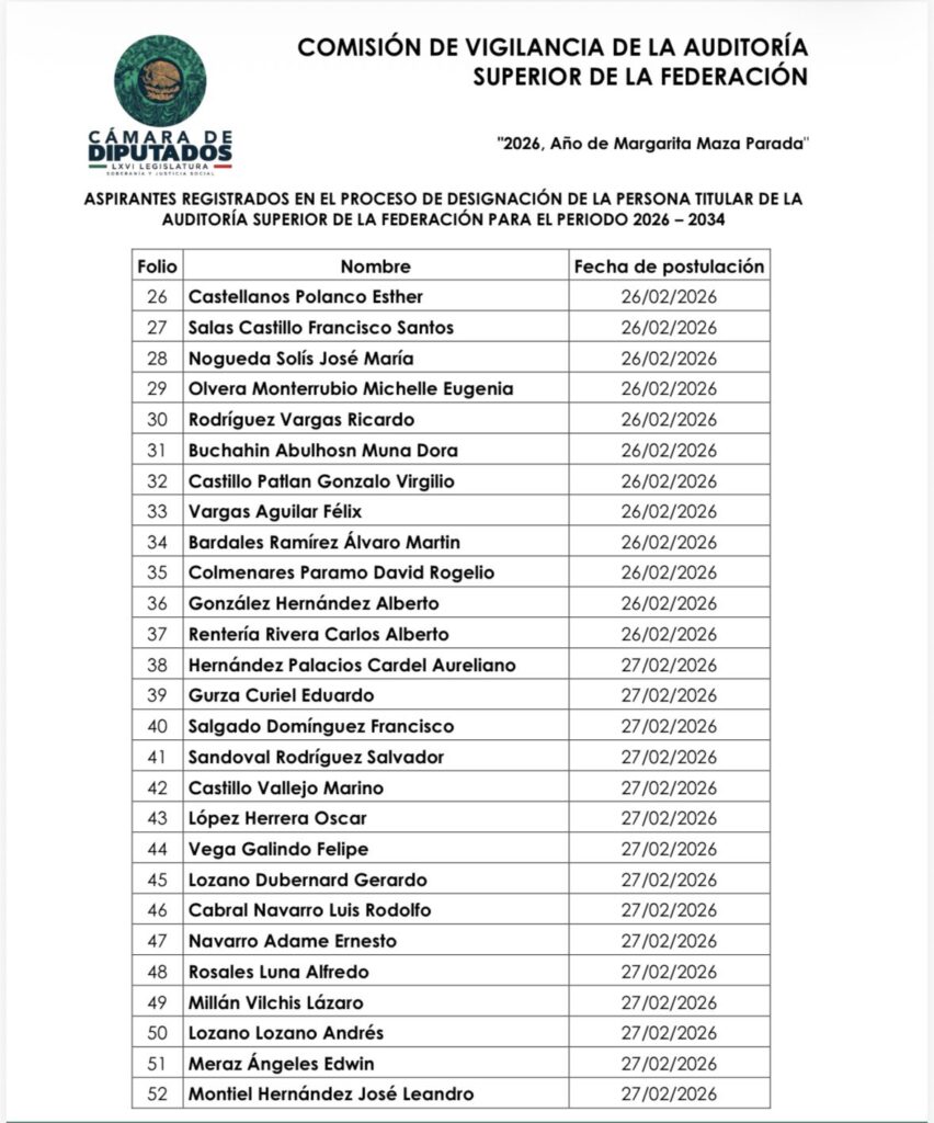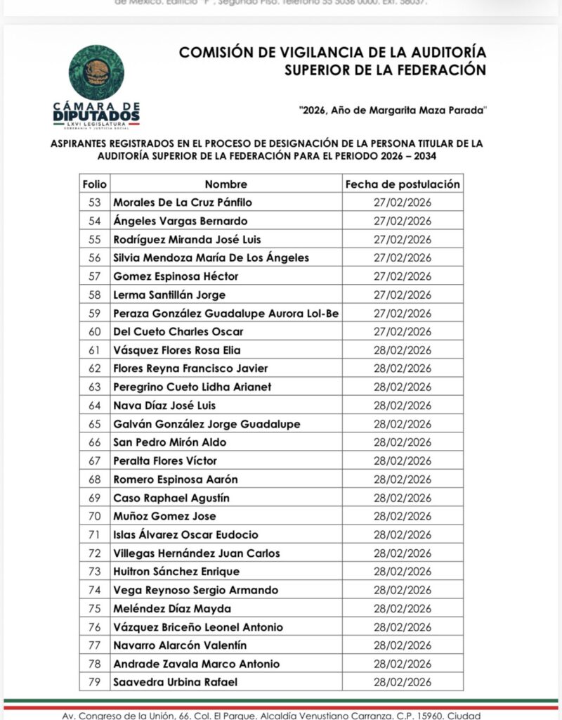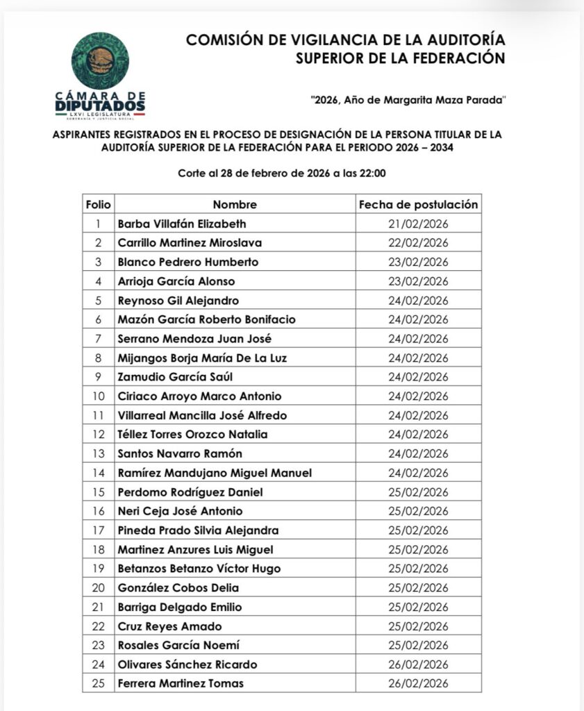 Ciudad de México, 2 de marzo del 2026.-   Sólo tres mexiquenses figuran en la lista de aspirantes a ocupar la titularidad de la Auditoria Superior de la Federación (ASF) para el periodo 2026-2034, según se observa en el listado de 92 personas que solicitaron registro para participar en este proceso de selección que organiza la Cámara de Diputados del Congreso de la Unión.