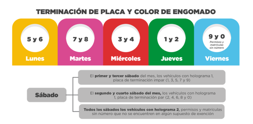 Para conocer los días de circulación de los vehículos, la ciudadanía debe consultar el color del engomado y la terminación numérica de la placa, a fin de identificar el día de restricción en el sitio oficial: https://sma.edomex.gob.mx/hoynocircula.