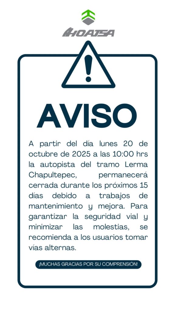 “A partir del día lunes 20 de octubre de 2025 a las 10:00 horas la autopista del tramo Lerma- Chapultepec, permanecerá cerrada durante los próximos 15 días debido a trabajos de mantenimiento y mejora. Para garantizar la seguridad vial y minimizar las molestias, se recomienda a los usuarios tomar vías alternas”, informó a través de sus redes sociales la empresaria concesionaria de la autopista.