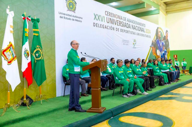 Toluca, Edomex 8 de mayo de 2024. Esperamos de ustedes compromiso y entrega total, confíen en sus habilidades para demostrar grandeza, sin olvidar que la práctica de una disciplina deportiva es la oportunidad para crear entornos positivos que sean complemento de una sólida formación académica, sostuvo el rector de la Universidad Autónoma del Estado de México (UAEMex), Carlos Eduardo Barrera Díaz, al abanderar a la Delegación de deportistas universitarios que participarán en la XXVI edición de la Universiada Nacional, que tendrá como sede a la Universidad Autónoma de Aguascalientes (UAA).