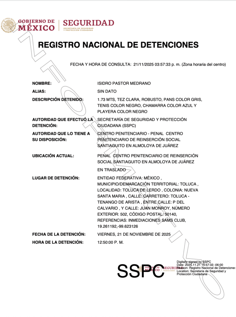 Toluca, Edomex 21 de noviembre del 2025.- El ex dirigente estatal del PRI y ex candidato independiente a la gubernatura del Estado de México, Isidro Pastor Medrano, fue detenido este viernes en calles de la colonia Nueva Santa María, en los límites de Toluca y Metepec, en cumplimiento de una orden de aprehensión, por el delito de operaciones con recursos de procedencia ilícita.