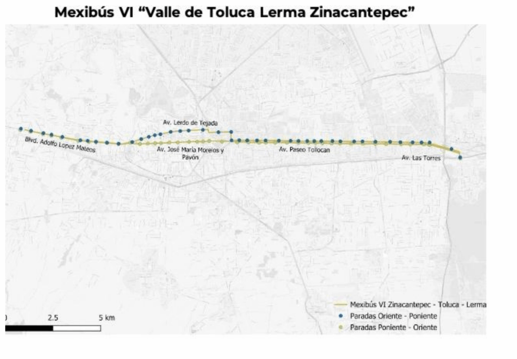 “Se crea el Corredor Masivo o de Alta Capacidad “Valle de Toluca Lerma – Zinacantepec”, que tendrá una ruta de 28.8 km por sentido aproximadamente, y será atendido a través del Sistema Mexibús Línea VI, con autobuses de alta capacidad con baja emisión de contaminantes, dotados con tecnologías para su despacho, control, operación y vigilancia, mismos que circularán por carriles exclusivos o confinados”