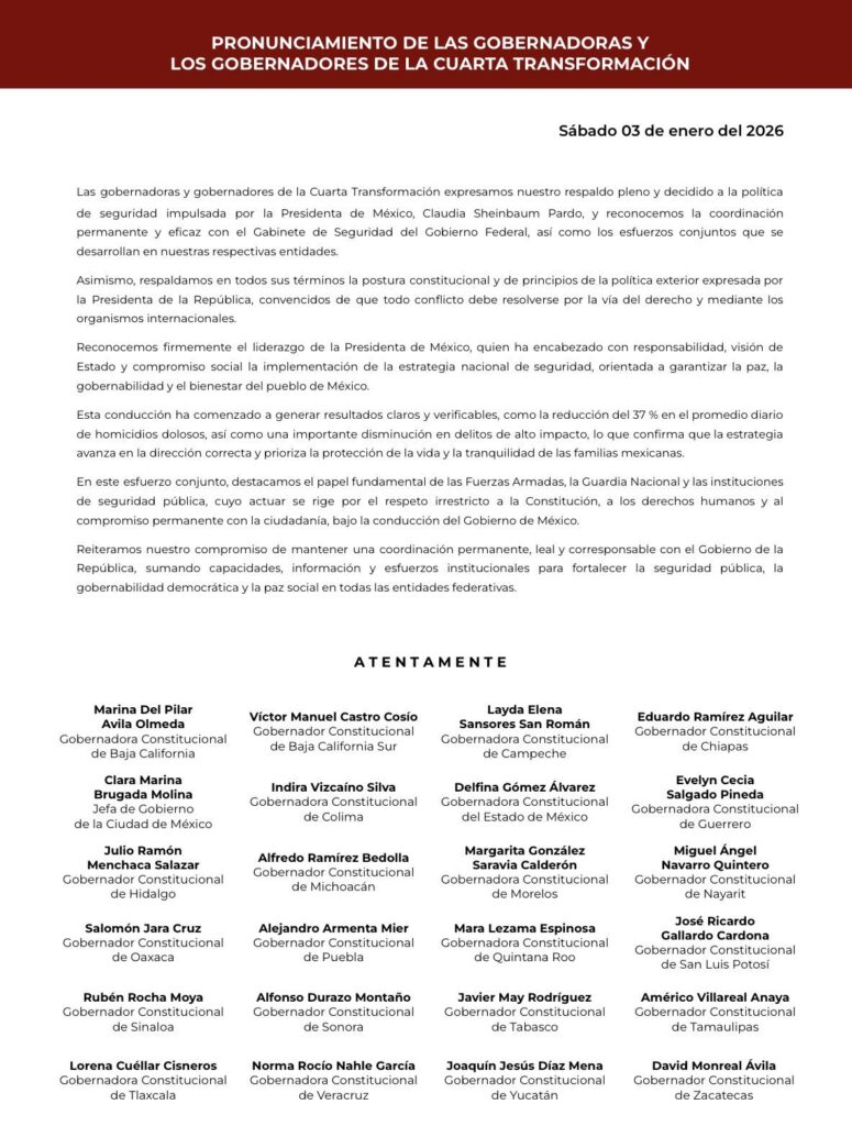 Ciudad de México, 3 de enero de 2026.- Las gobernadoras y gobernadores de la Cuarta Transformación difundieron un desplegado en el que expresan su respaldo pleno y decidido a la estrategia de seguridad y la política exterior impulsada por la presidenta de México, Claudia Sheinbaum Pardo.