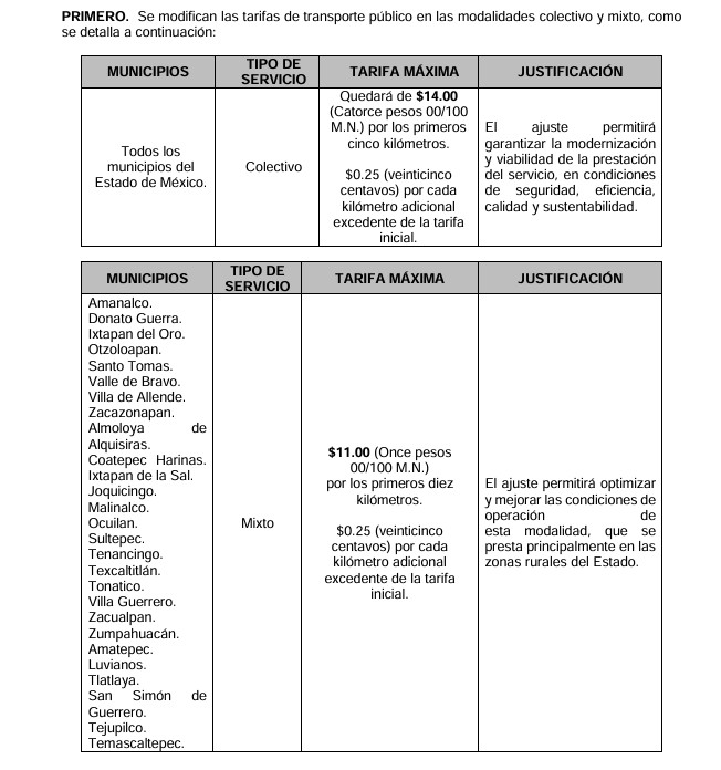 Toluca, Edomex; 11 de octubre de 2025.- La Secretaría de Movilidad del Estado de México informó que, a partir del miércoles 15 de octubre, la tarifa del transporte colectivo para los 125 municipios de la entidad quedará fijada en 14 pesos para los primeros 5 kilómetros, y de 25 centavos por cada kilómetro adicional excedente de la tarifa mínima.
