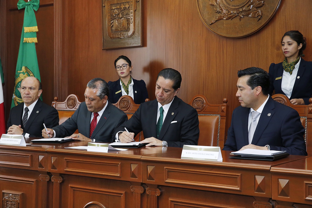 Víctor Manuel Pineda Gutiérrez y León Carmona Castillo resaltaron la responsabilidad social asumida por los integrantes de ambos sindicatos frente a la situación económica del país, sin olvidar su compromiso para que la Máxima Casa de Estudios mexiquense siga destacando por su calidad en los ámbitos nacional e internacional.
